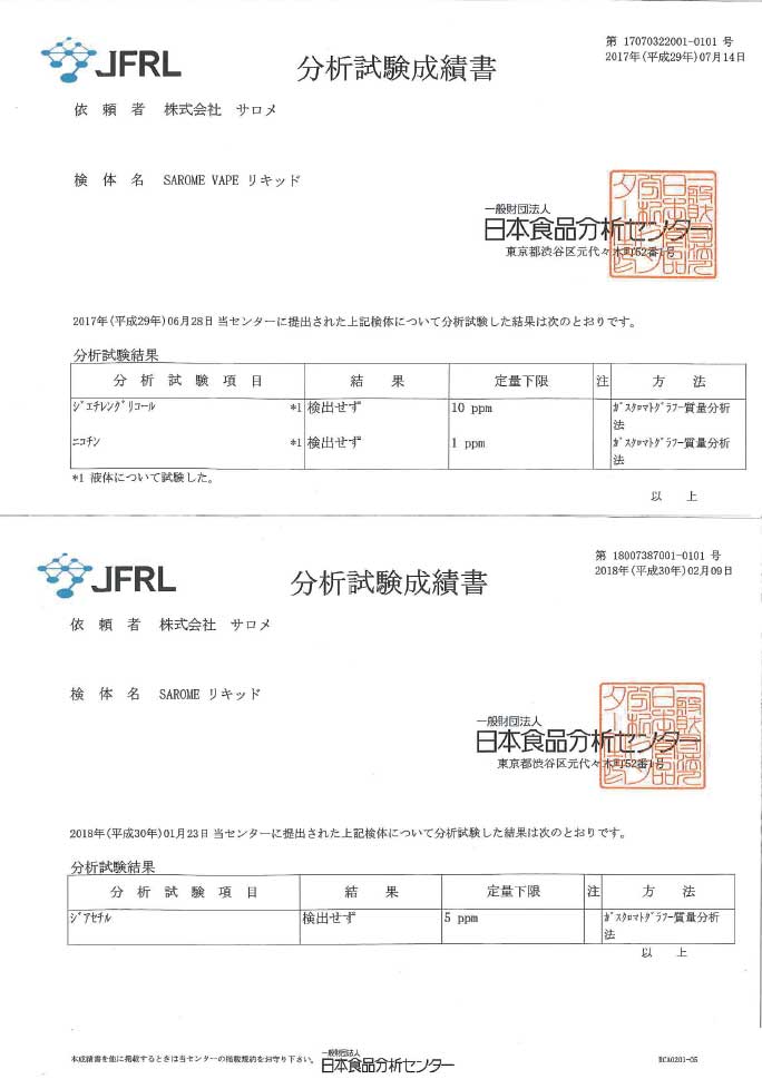 すべて自社の工房で製作されており、SAROMEリキッドは第三者機関JFRLでの分析試験を実施し、